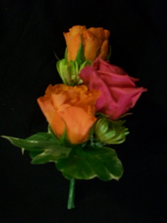 Handtied bouquet of Cerise Gerbera, Orange Gerbera, Red bromiliad and Green Cymbidium Orchid. Edged in Palm Leaves.