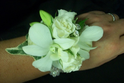 Wrist corsage with White Spray Roses and White Dendrobian Orchids