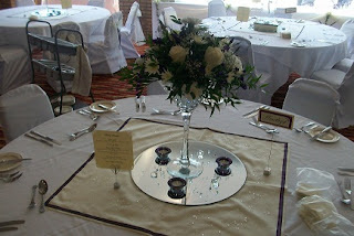 A top table design of roses. lisianthus, waxflower and mixed flowers.