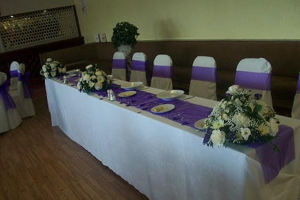 The Top Table consisted of three posy designs with ivory and purple flowers.