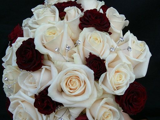 Julie had a bridal bouquet of ivory roses with burgandy spray roses... wrapped in ivory satin ribbon.