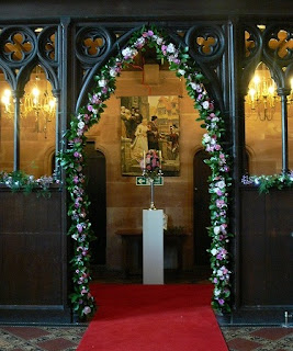 The archway was fresh with roses, spray roses, hyrdrangea, gypsophelia and other filler flowers. Truly stunning, espeically in "real life".