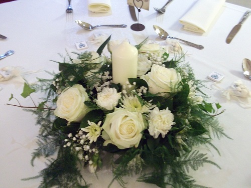 Nothing to big, just some nice roses to compliment her dress and some table centres to make the room look nice.  Unfortunately, we could not get a picture of the final room as they had their civil ceremony in the same room... but you can get an idea for the bridal designs..