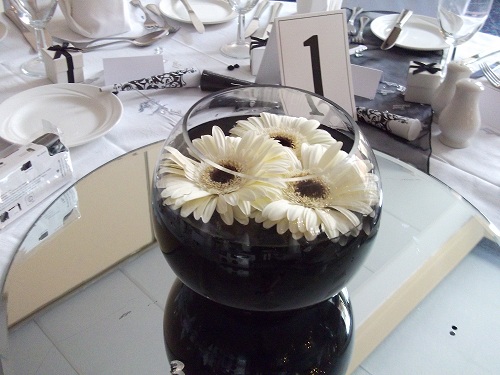 For the tables Anna chose a fishbowl with black water and floating white Gerbera.