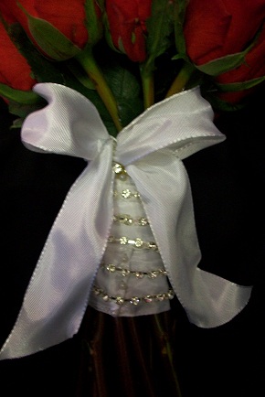 This shows the diamante detail we did for the bride on the handle of the bouquet. Satin or organza ribbon is our favourite for dressing a handle and it portrays an elegance that can only be matched by the flowers themselves.