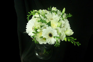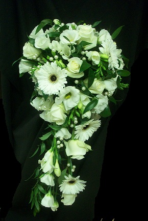 To compliment Diane's Black and White colour scheme, we both opted for the Germini in White with a dark centre. The bride was keen on the cascading design and to for the bridesmaids, we thought a handtied with similar flowers would be a great match.