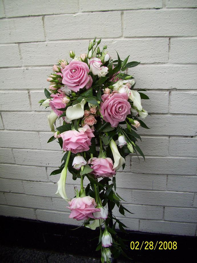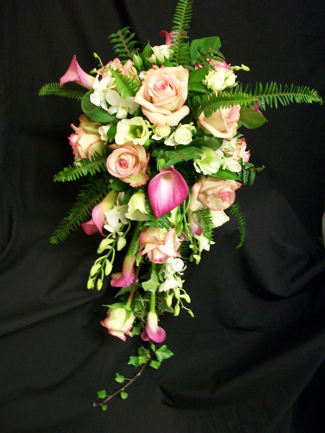 Dendrobrian Orchids give a lovely trail to this shower bouquet which is filled with Pink Calla Lillies and Roses.