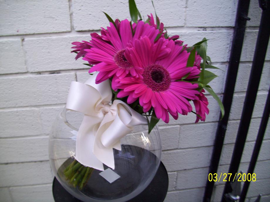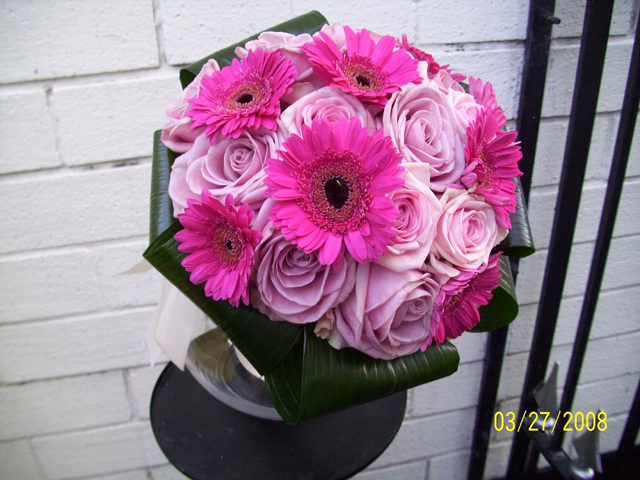 Pale Pink Roses and Cerise Pink Gerbera in a handtied bouquet.