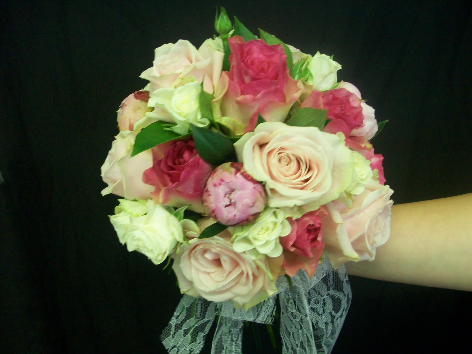 Heaven Roses, Pink Spray Roses and White Lisianthus make up this handtied bouquet.
