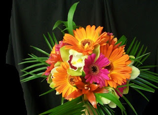 Handtied bouquet of Cerise Gerbera, Orange Gerbera, Red bromiliad and Green Cymbidium Orchid. Edged in Palm Leaves.