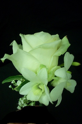 White Avalanche Rose buttonhole with Dendrobian Orchid and Gypsophelia.